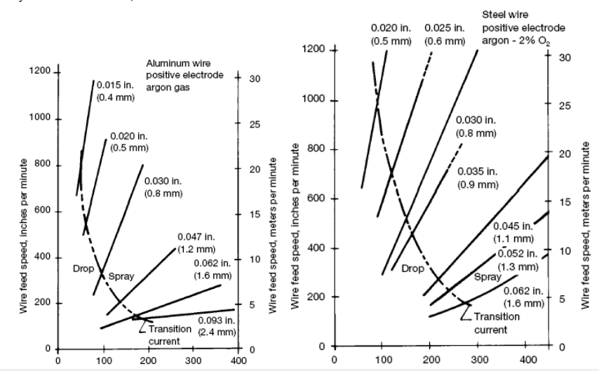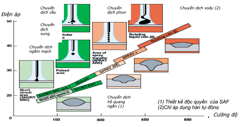 Dịch chuyển : Chuyển dịch cầu ,Chuyển dịch phun,Chuyển dịch xoáy(2),Chuyển dịch xung ,Chuyển dịch ngắm mạch,Chuyển dịch hồ quang ngắn (1),(1) thiết kế độc quyền của SAF (2)Chỉ ỏp dụng hàn tự động,Cường độ.Ba kiểu chuyển dịch cơ bản là ngắn mạch, cầu và phun . Gần đây các kiểu chuyển dịch tiên tiến như chuyển dịch sức căng bề mặt , chuyển dịch xoáy đã được áp dụng trong các thiết bị GMAW tư động.Các kiểu chuyển dịch phụ thuộc vào các đặc trưng dây đắp và môi trường khí bảo vệ. Hình mô tả đặc trưng nóng chảy và các kiểu chuyển dịch của dây nhôm và thép khi hàn MIG (Chỉ số oxy hóa nhỏ hơn 2%).