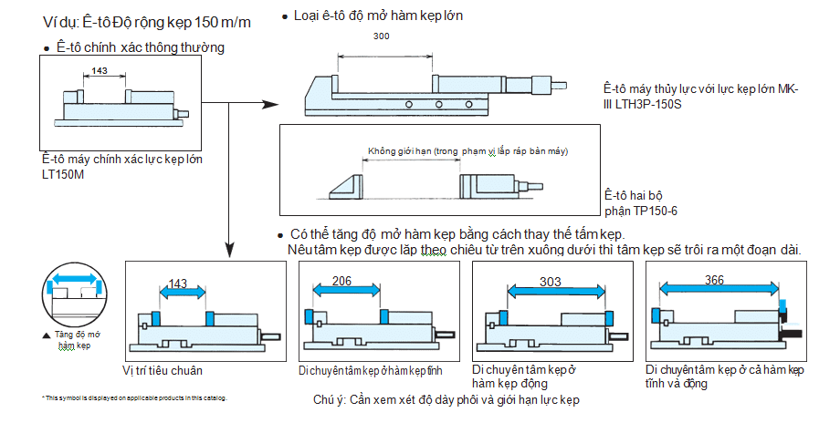 Bạn cần lựa chọn ê-tô mà có độ mở hàm kẹp thích hợp để kẹp phôi. Đối với các ê-tô chính xác nói chung thì độ mở hàm kẹp tương đương với độ rộng kẹp. Tuy nhiên, với một vài model, loại “độ mỏ hàm kẹp lớn” hoặc loại “có thể tăng độ mở hàm kẹp” thì cũng có thể thay tấm kẹp để thay đổi độ mở hàm kẹp.